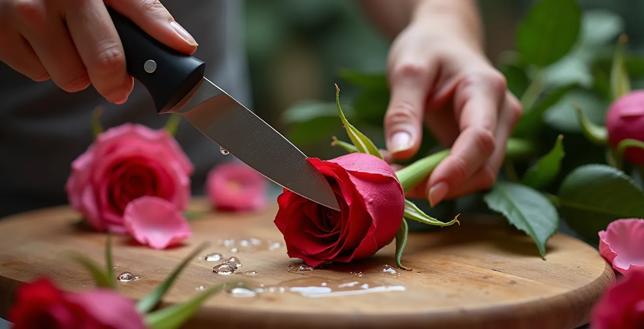 - Outil de choix : Un couteau de fleuriste ou une serpette à lame unique et très aiguisée est l’idéal pour les tiges tendres (roses, tulipes).