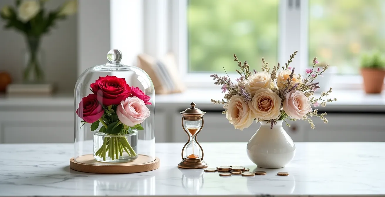 Le calcul est sans appel. Comme le résume un expert sur Gerbeaud.com, «les fleurs stabilisées ne sont pas plus chères que des fraîches car elles sont 2 à 3 fois plus chères pour un usage qui dure minimum 50 fois plus longtemps». C’est un changement de paradigme financier : on passe d’une dépense récurrente à un investissement unique et amorti. Payer le prix fort, c’est en réalité acheter la tranquillité budgétaire pour les années à venir.